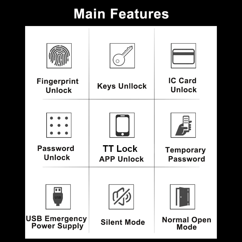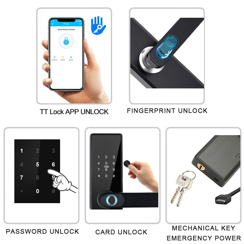 6 unlock methods: TT Lock APP/Fingerprint / Password / Smart Card / Key/ Temporary password Unlock