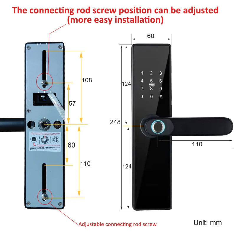 The connecting rod screw on the back of lock is adjustable , which compares with the traditional electronic lock with fixed screw , H4 is more convenient to install.