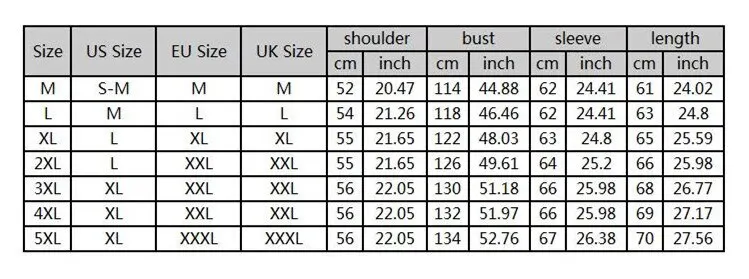 Size: M,Shoulder: 52cm; : 114cm; Sleeve: 62cm<> Size: L,Shoulder: 54cm; : 118cm; Sleeve: 62cm<> Size: XL,Shoulder: 55cm; : 122cm; Sleeve: 63cm<> Size: 2XL,Shoulder: 55cm; : 126cm; Sleeve: 64cm<> Size: 3XL,Shoulder: 56cm; : 130cm; Sleeve: 66cm<> Size: 4XL,Shoulder: 56cm; : 132cm; Sleeve: 66cm<> Size: 5XL,Shoulder: 56cm; : 134cm; Sleeve: 67cm