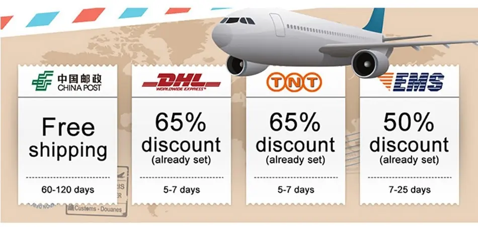 1. Standard Service is China Post Ordinary Small Packet & China Post Registred Air Mail which take 20-60 days.<> 2. Order Value> $ 120 Free Shipping Via EMS, DHL or Fedex.<> Order Value> $ 5 Via China Post Registred Air Mail.<> If you need fast express please contact us when your order is less than $ 120<> 4. If you have not received your order after 30 days from payment, please contact us. We will trace your order and get back to you asap. Our goal is customer satisfaction!